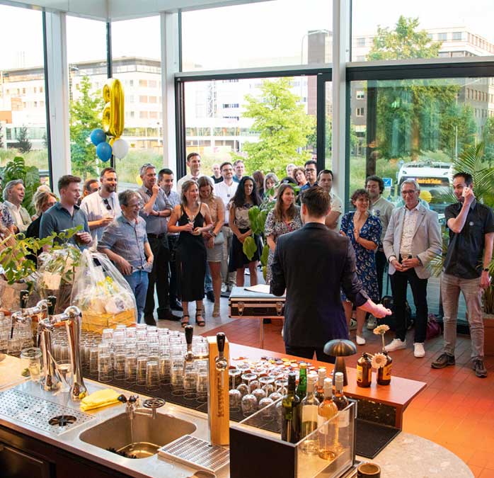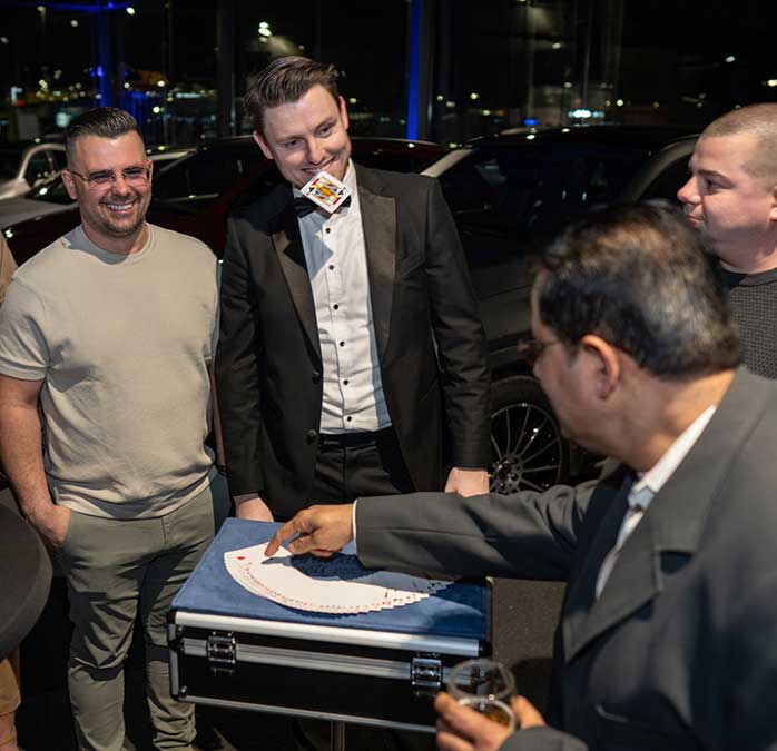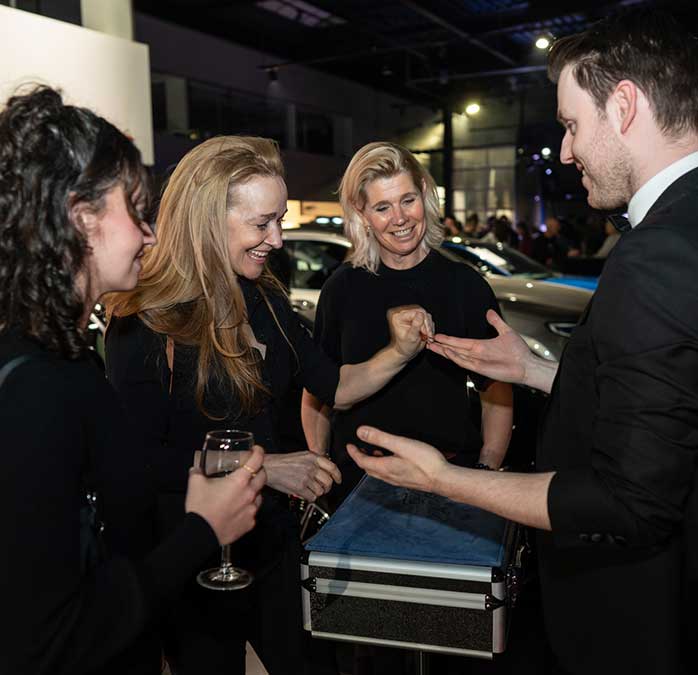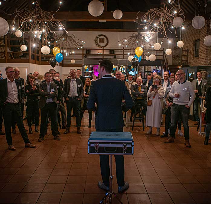 With his magical intermezzo, attendees aren’t just passive observers—they become active participants! Picture this: as he performs a magic trick on stage, all participants get to execute it themselves alongside him. After following his steps, a small wonder will appear in their hands. The energy and engagement that this interactive element creates is superb! The tricks can even be customized to your brand or products.
