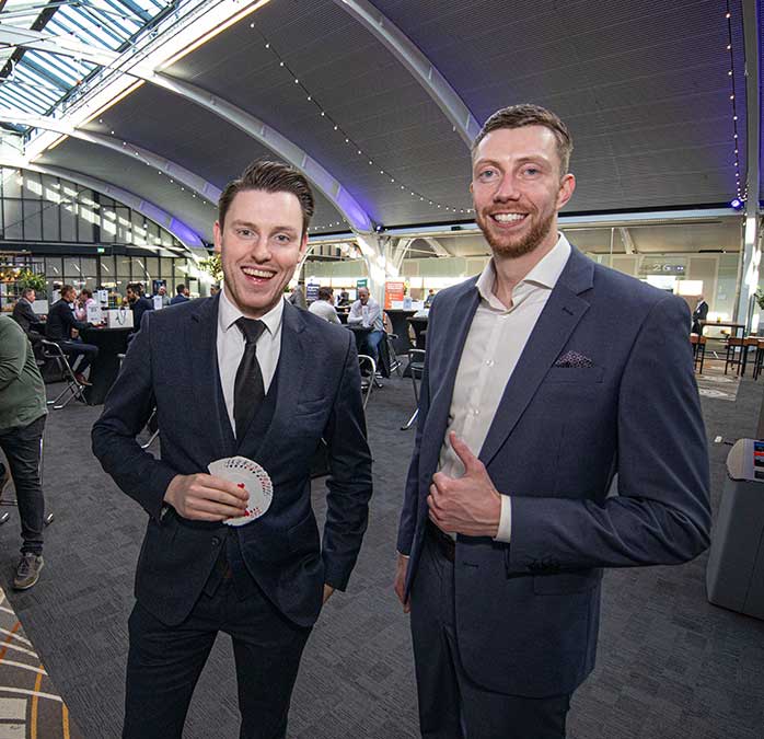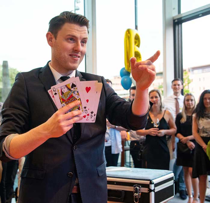 Brandon adds a magical touch to conferences and trade fairs worldwide every week. Thanks to his trilingual upbringing (Dutch, English, German) there are endless possibilities. A presenter, magical intermezzo, lead generator in your booth, speaker, or walk-around magician, his wide repertoire and customization possibilities allow him to be versatile. What are you looking for?