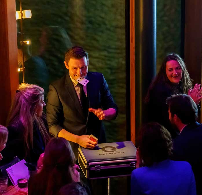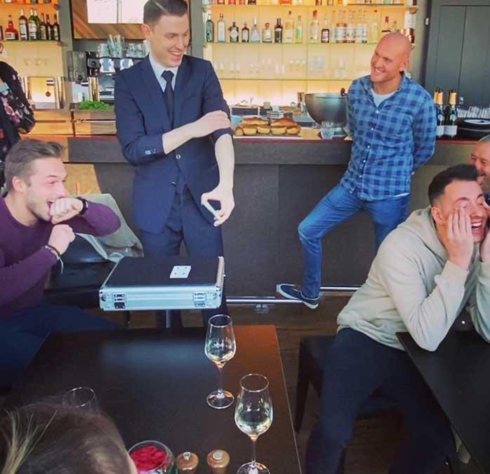 Table magic is a form of entertainment that adds value to any event. Your guests experience the magic right under their noses, literally. You cannot be closer than this! And yet, you can still not discover how these small miracles happen. Using daily objects from spectators or just a deck of cards, Brandon entertains your guests humorously and interactively. This gives a magical touch to your event, connects people, and works perfectly like an icebreaker or evening-long fill-in. There are endless possibilities; it is just a matter of What, Where, When?