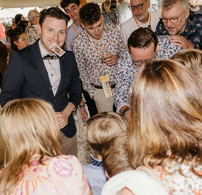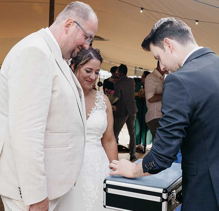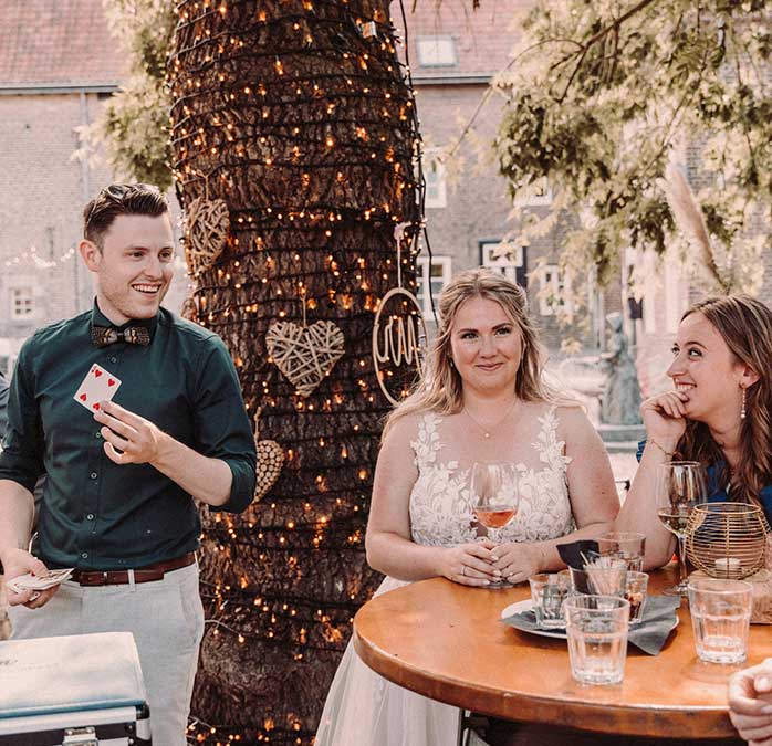 Every wedding is unique, and timing is key. As a couple, you have a full schedule from the morning to the evening, but the guests often do not. We all have been to a wedding where we had to wait for the next thing to happen or where it was actually a bit boring until the party started. Therefore, it is good to add some extra atmosphere or entertainment so that the guests also experience something until the party starts. The most common moments for magic entertainment are during the reception (after the ceremony), the photo session of the couple, dinner, or when the evening guests walk-in. Love is magical, and so are Brandon’s magic tricks. He loves to share that joy and excitement with you and the guests.